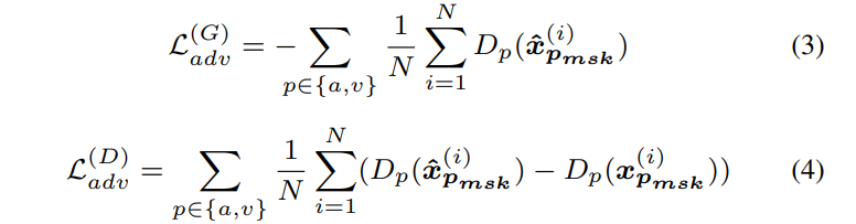 Reconstruction loss 와 비슷하게 adversarial loss는 마스킹된 토큰에서만 계산된다.