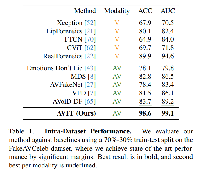 이 논문에서는 2단계 cross-modal 러닝 방식을 사용하여 오디오와 비주얼 모달리티 사이의 상관관계(correspondence)를 잡는 Audio-Visual Feature Fusion (AVFF)을 제안한다. 1딘계에서는 self-supervision 방식으로 representaion learning을 진행하여 내재적(intricsic)인 오디오-비주얼 관계를 예측한다. 풍부한 cross-modal 표현을 얻기 위해서 contrasive learning과 autoencoding objectives 방식을 사용하며, 새로운 오디오-비주얼 보완 마스킹과 feature fusion 방식을 소개한다. 학습된 representations은 2단계로 가서 supervised deepfake classification을 수행한다. FakeAVCeleb 데이터셋에서 98.6% accuracy and 99.1% AUC 으로 SOTA를 달성했다.