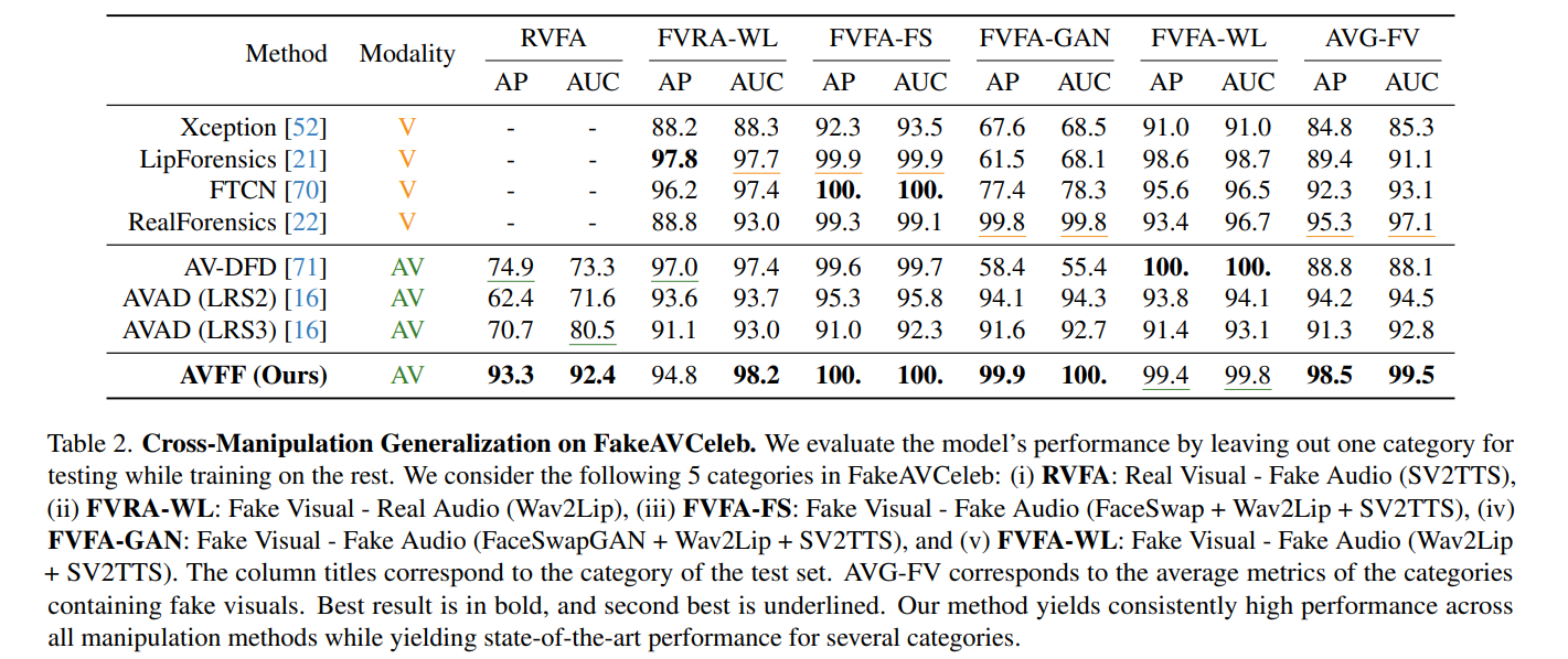 FakeAVCeleb는 RVFA, FVRA-WL, FVFA-FS, FVFA-GAN, FVFA-WL 방식들로 생성된 데이터로 구성된 데이터셋인데, 각 카테고리 별로 한 개만 남겨두고 나머지는 다 학습시킨 뒤, 남겨둔 방식에 대한 성능을 검증했다.