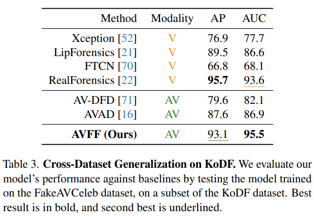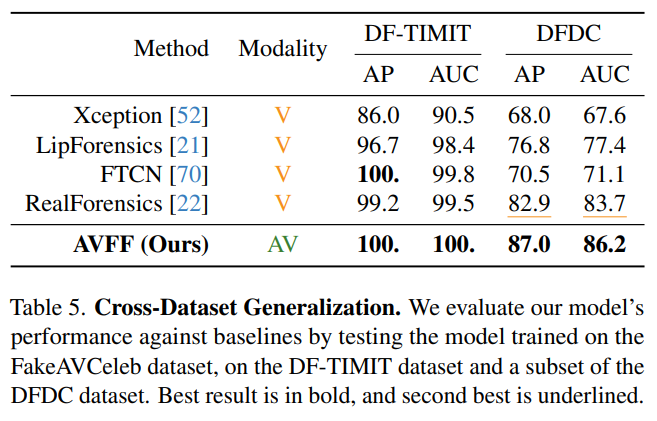 제안한 모델이 FakeAVCeleb 에서 멀티, 단일 모달 모델들을 추월하여 SOTA 찍음.