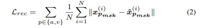 Reconstruction MSE loss인 Lrec는 입력 (xa,xv)과 그들의 reconstructions인 (ˆxa,ˆxv)로부터 계산. MAE 방식에 따라 마스킹된 토큰에 대해서만 계산.