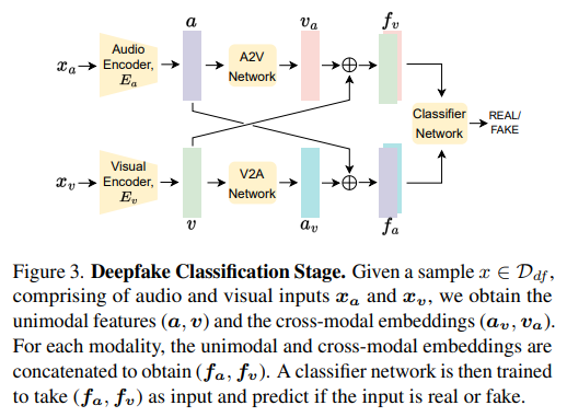 이 단계의 목적은 오디오나 비주얼 둘 중 하나 이상 fake일 때 deepfake 비디오를 찾는 것이다. 그러기 위해서 인코더와 representaion learning 단계에서 학습된 크로스 모달 네트워크를 사용하였다.