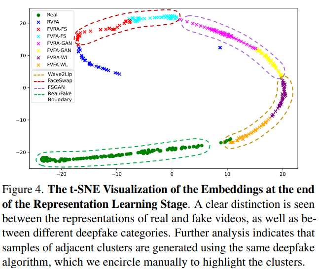 • Qualitative analysis using t-SNE [58] shows a clear separation between the real and fake video embeddings at the end of the representation learning stage. This demonstrates the